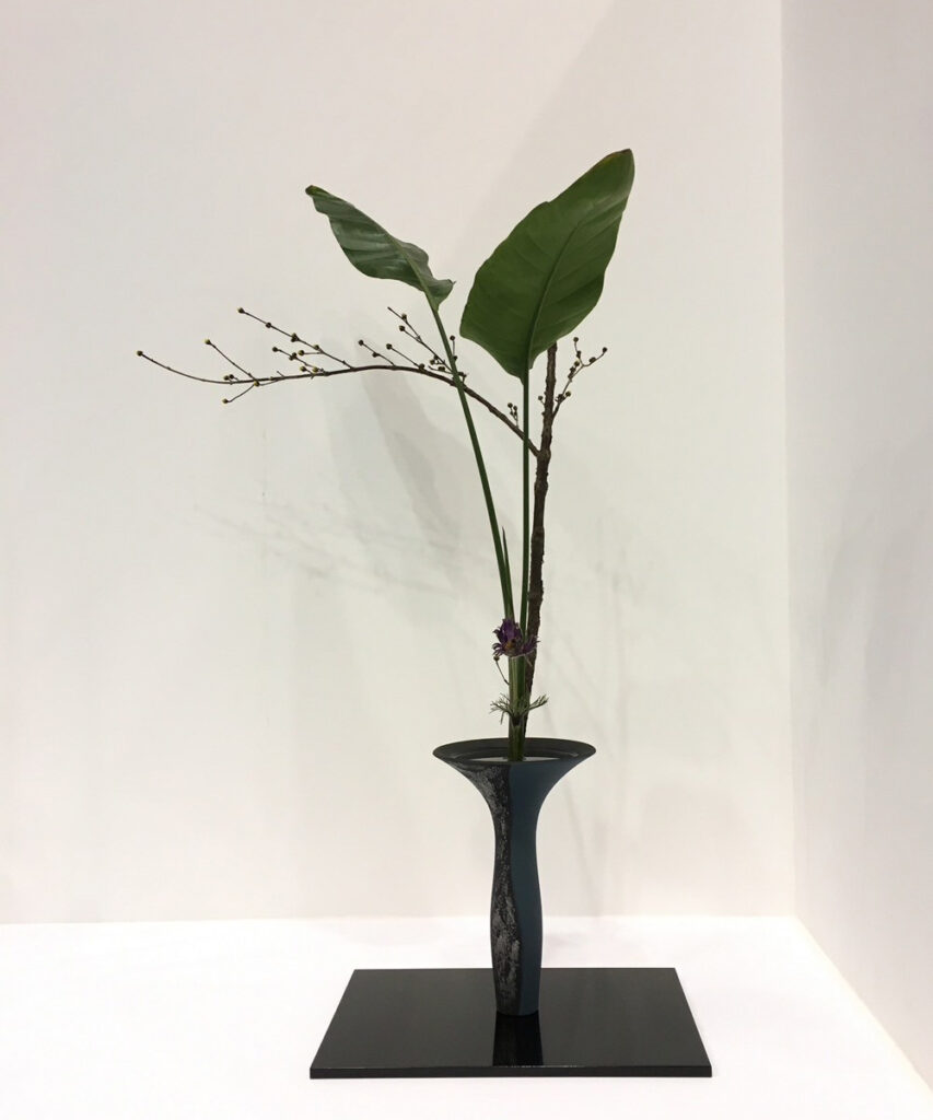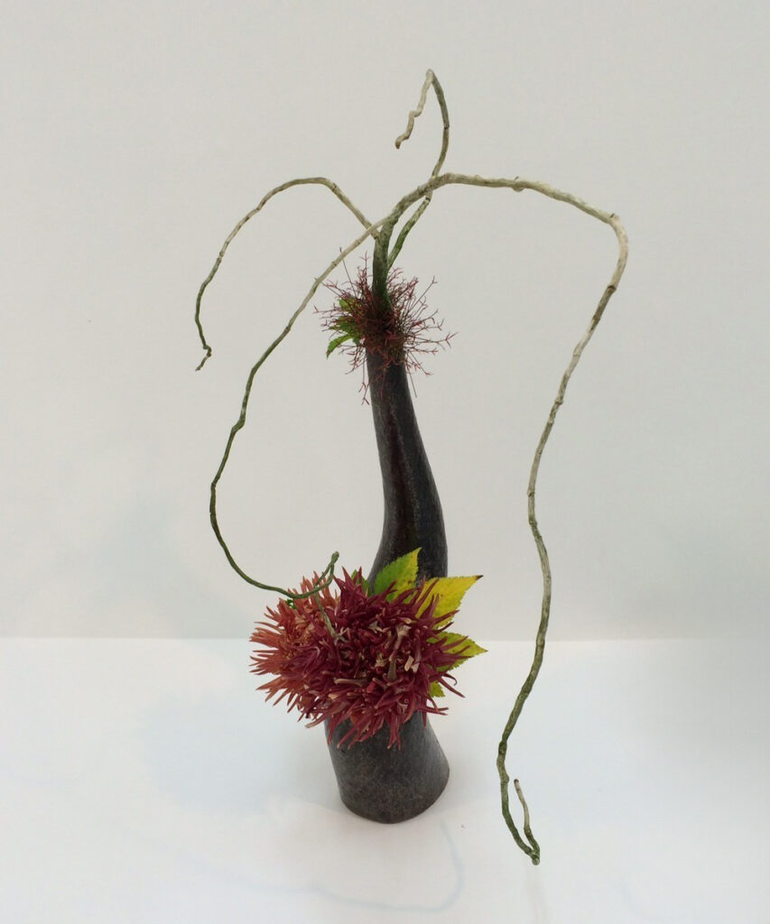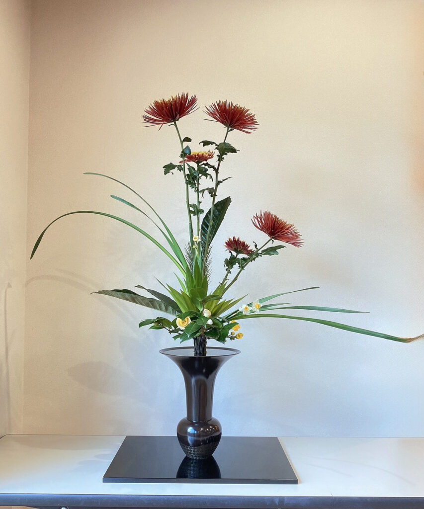 生花は江戸時代に成立した様式で、1~3種類の花材を用い、草木が地に根を張り生きる姿を表現します。